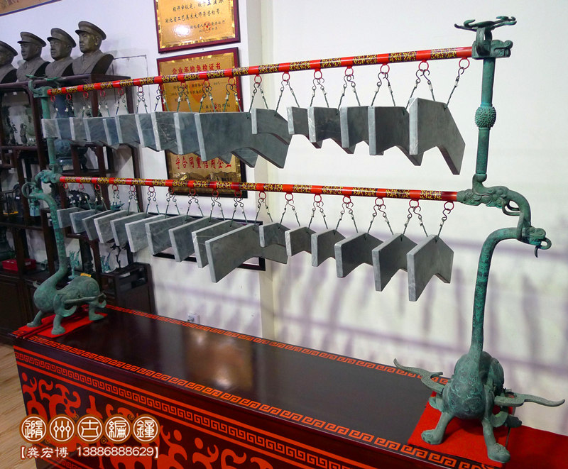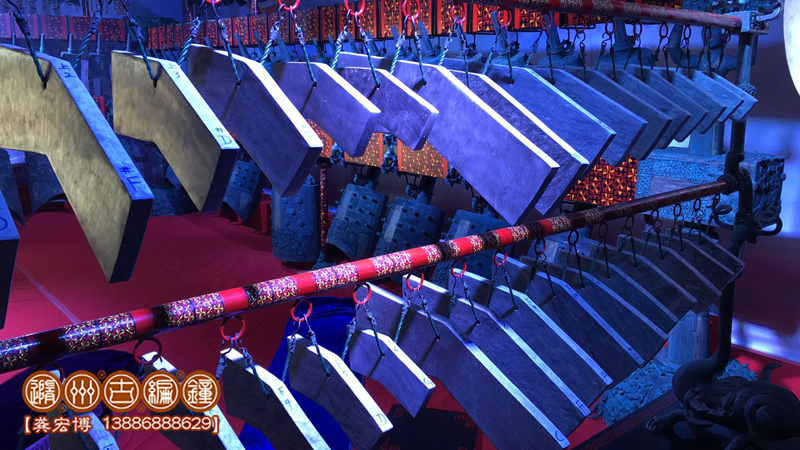隨州市古編鐘文化發(fā)展有限公司通過(guò)考證歷史資料進(jìn)行研究分析,并八方尋找石源,終于將這套2400多年前的戰(zhàn)國(guó)初期大型編磬復(fù)制出來(lái),其發(fā)音與原編磬的標(biāo)音銘文相符,低音渾厚洪高,高音明澈,音色優(yōu)美而動(dòng)聽(tīng),音域達(dá)三個(gè)八度,可以旋宮轉(zhuǎn)調(diào),演奏多種樂(lè)曲。