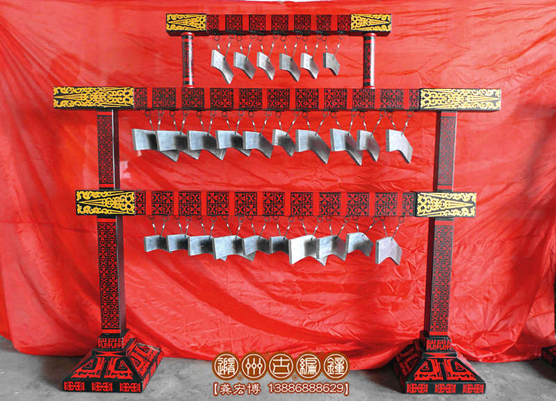 16件套系編磬規(guī)格:長2米×寬0.4米×高1.8米,懸掛22塊磬片,共三層,上空,中11塊,下11塊,編鐘編磬的大梁和底桌采用優(yōu)質杉木加工制作,表面彩繪仿古花紋。