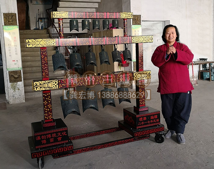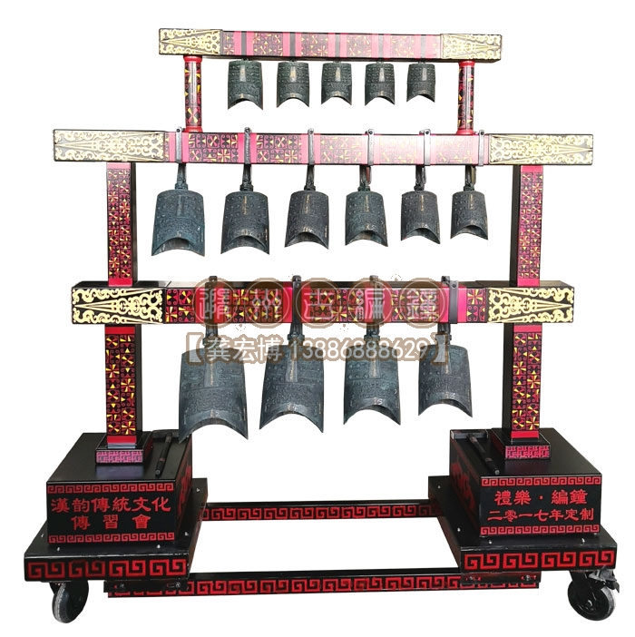 合肥漢韻文化傳習(xí)會(huì)定制的15件3層編鐘長(zhǎng)1.9米、高1.86米、寬0.5米,音律齊全,演奏使用方便,木架上可以彩繪客戶定制文字或圖案,底部安裝鋼制滑輪,安裝移動(dòng)都非常方便,配有樂(lè)器標(biāo)準(zhǔn)航空箱,外出表演得心應(yīng)手。